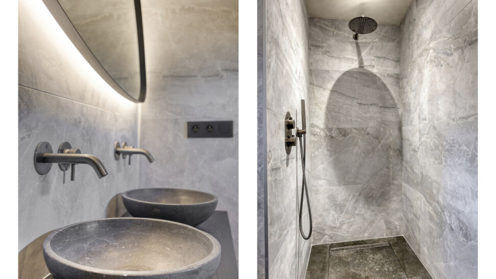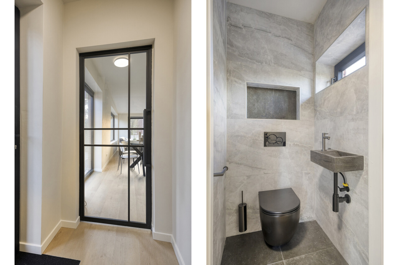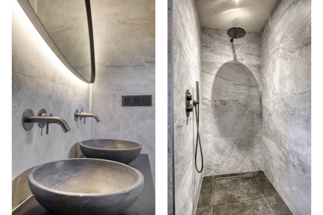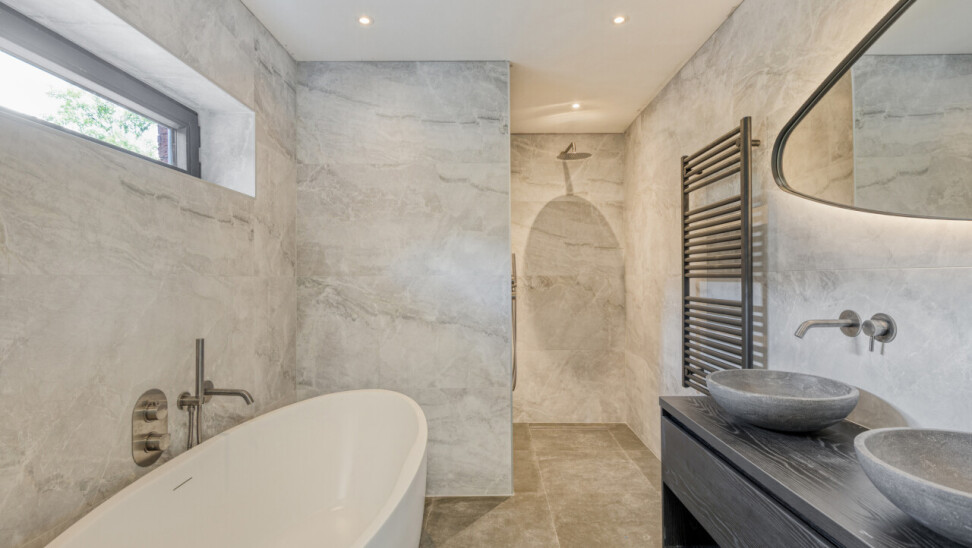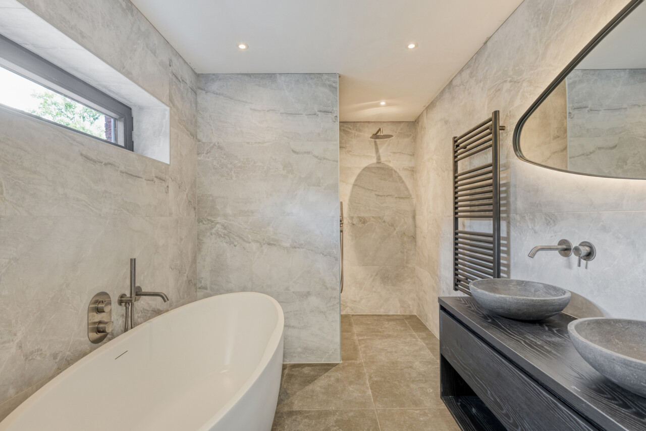 Badkamer : luxe nieuwe badkamer met ligbad, inloopdouche, badkamermeubel met 2 wastafels.