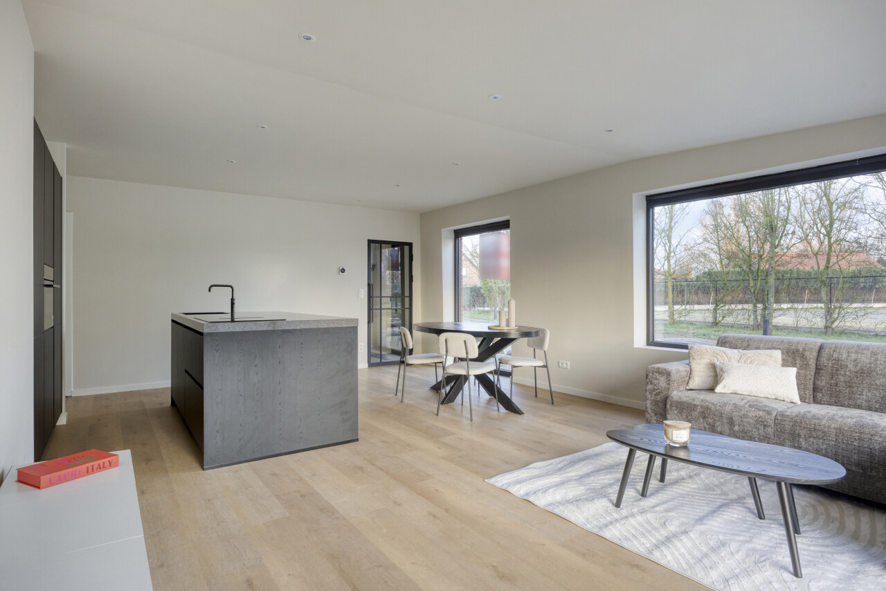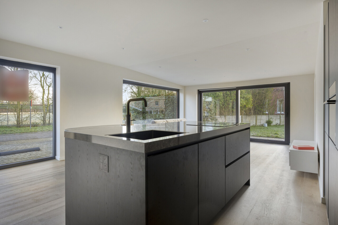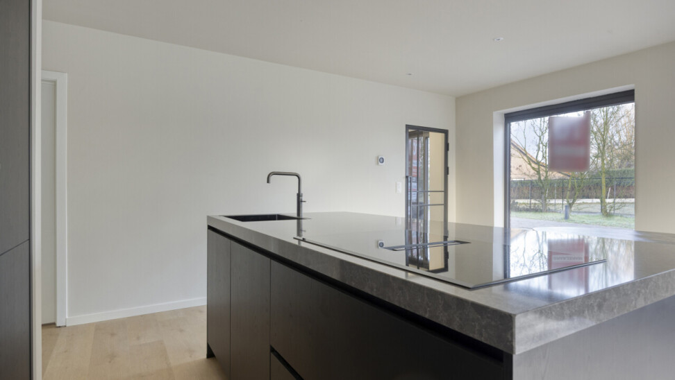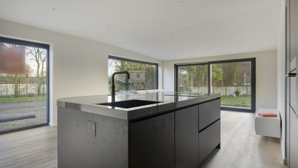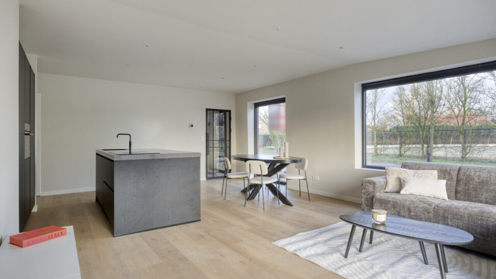 Woonkamer met open keuken : 7,60 m x 4,75 m : nieuwe aanbouwkeuken met inductie kookplaat, dampkap, combi-oven, vaatwasser, koelkast.