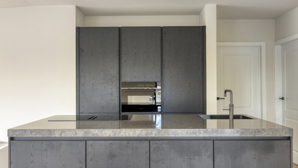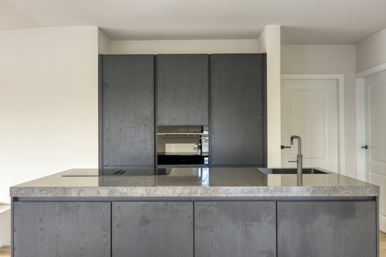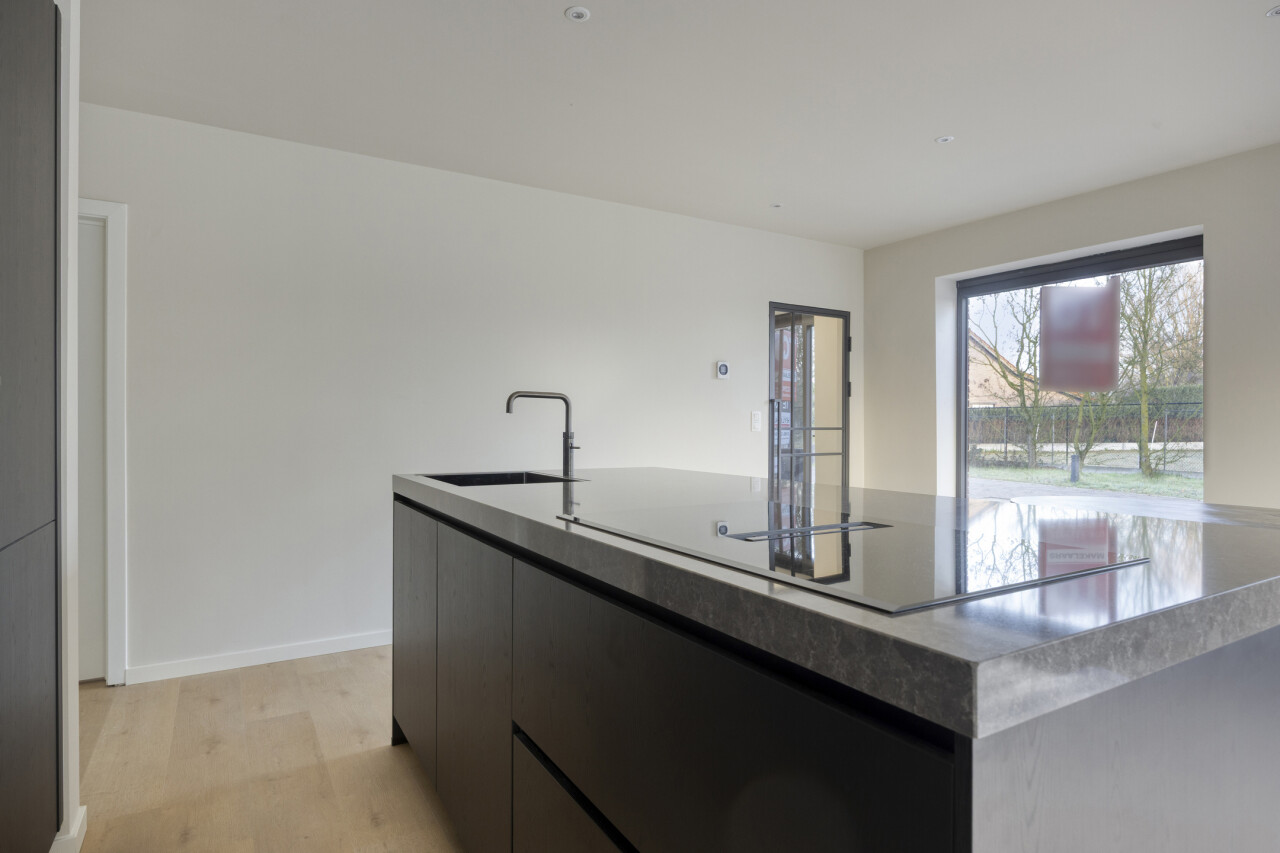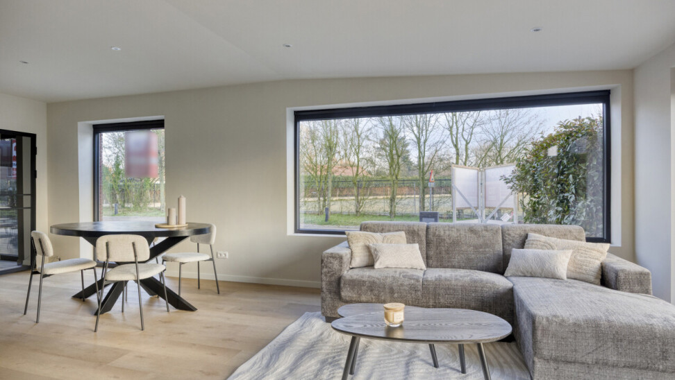 Woonkamer met open keuken : 7,60 m x 4,75 m : nieuwe aanbouwkeuken met inductie kookplaat, dampkap, combi-oven, vaatwasser, koelkast.