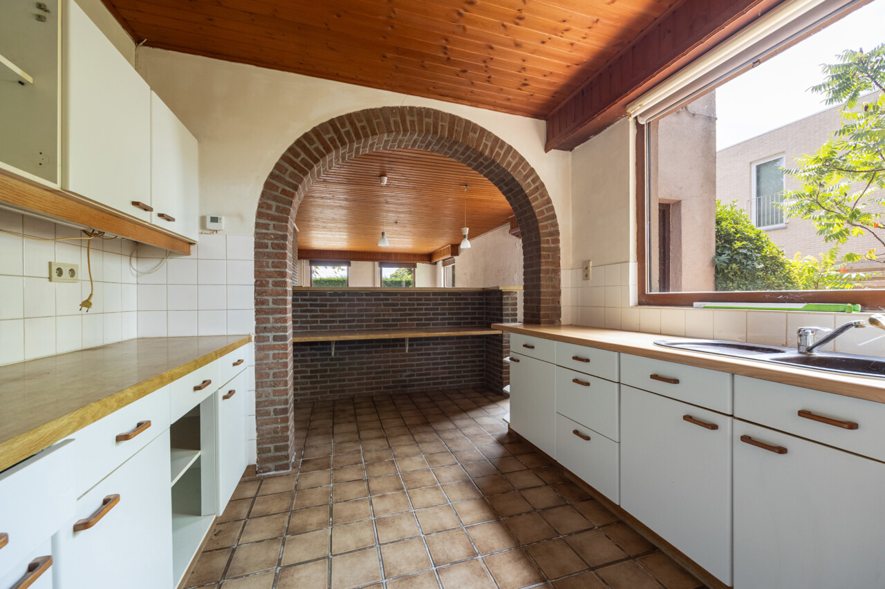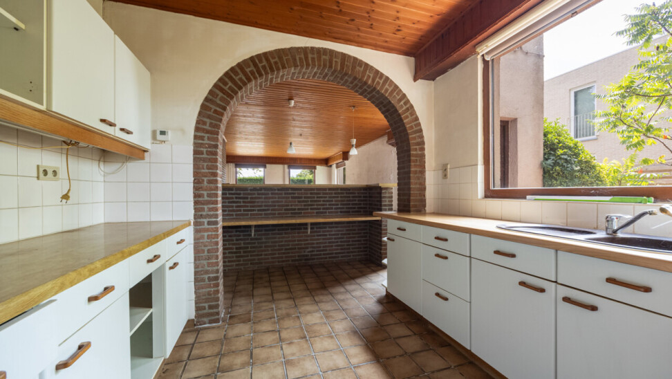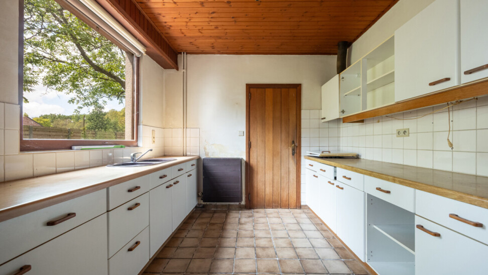 Keuken : tegelvloer, aanbouwkeuken met beperkt comfort.