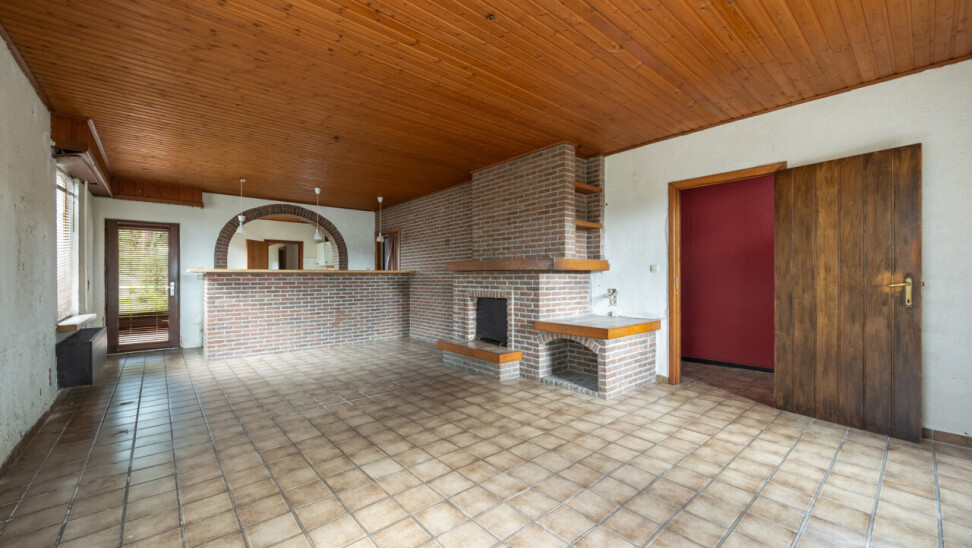 Woonkamer : 8,37 m x 4,18 m : tegelvloer, sierschouw met open haard