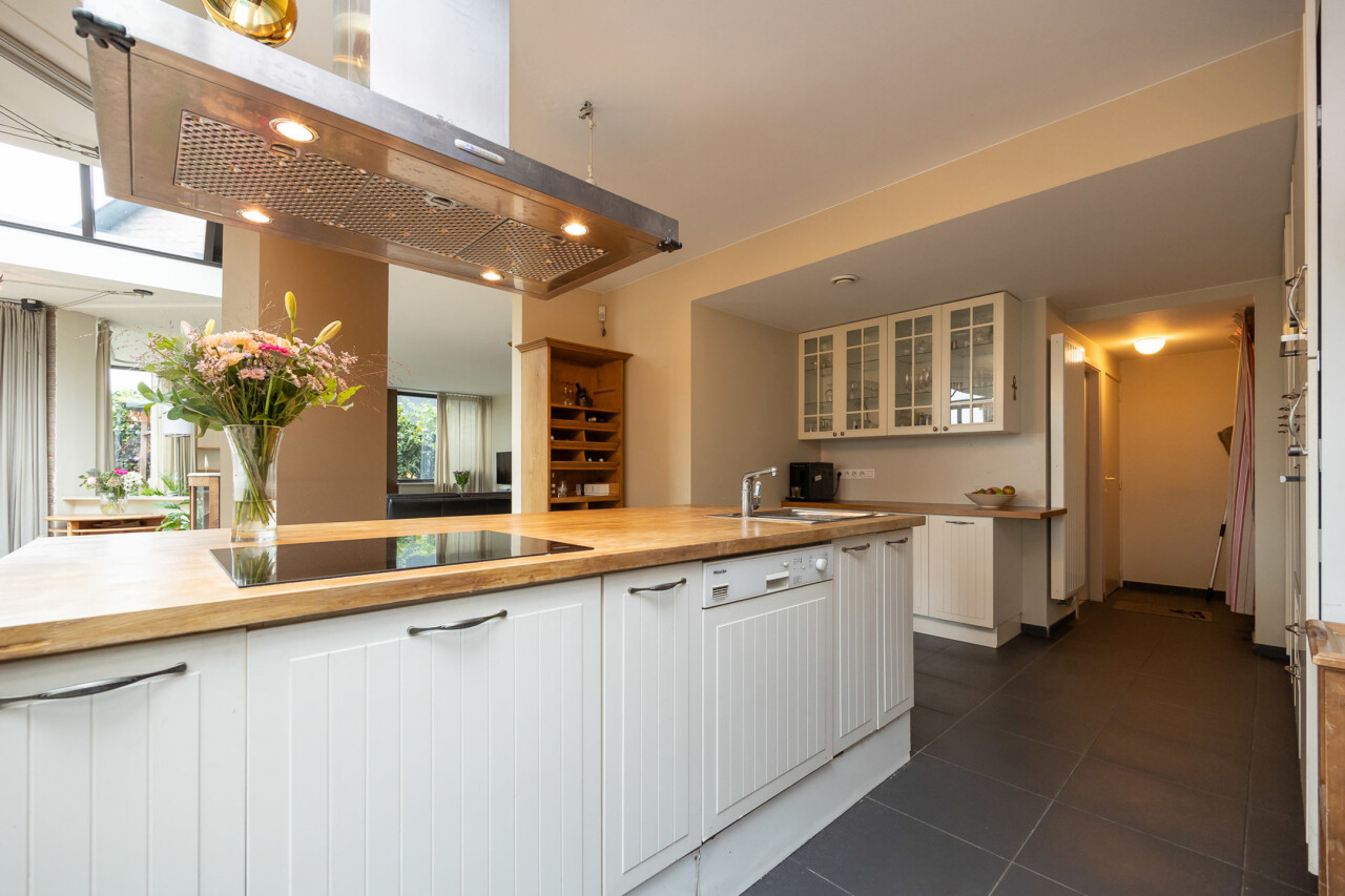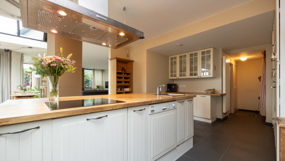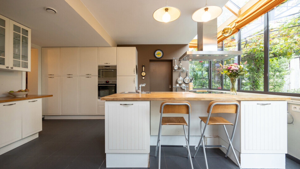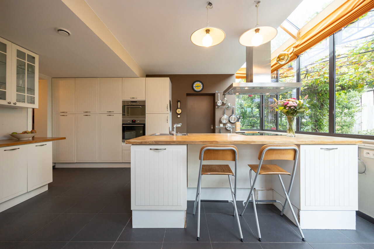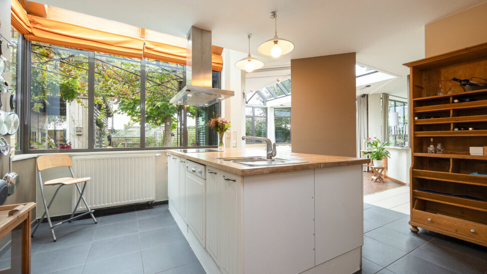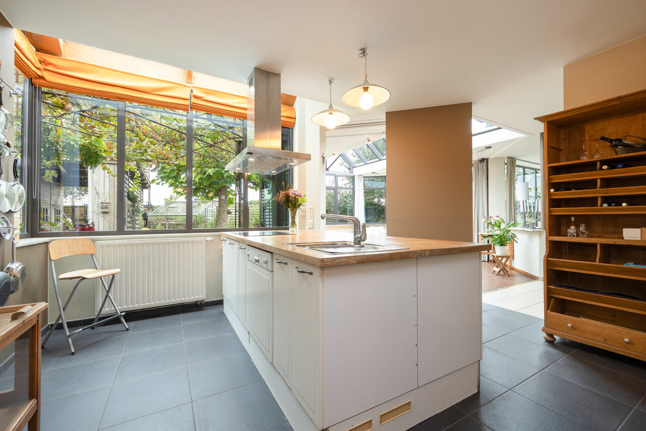 Keuken : 20,00 m² : tegelvloer, aanbouwkeuken met Miele inductie kookplaat, dampkap, Miele koelkast, combi-oven, microgolfoven, vaatwasser.