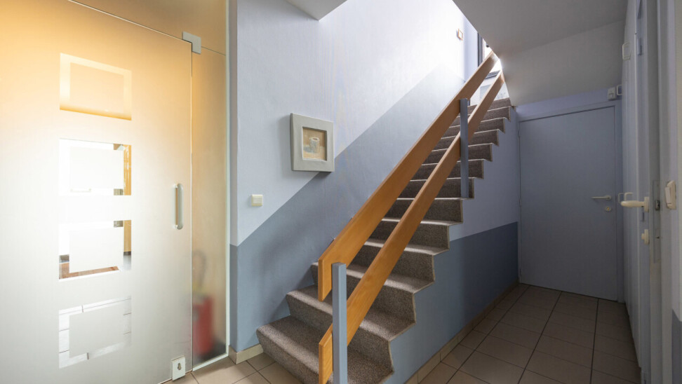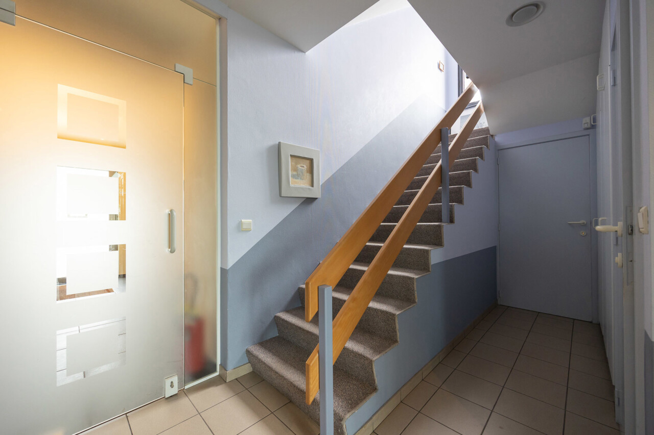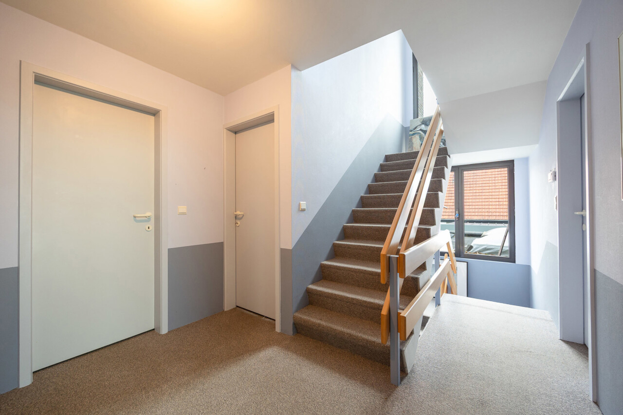 Tussenhal : met ingemaakte kasten en trap naar de verdieping.
