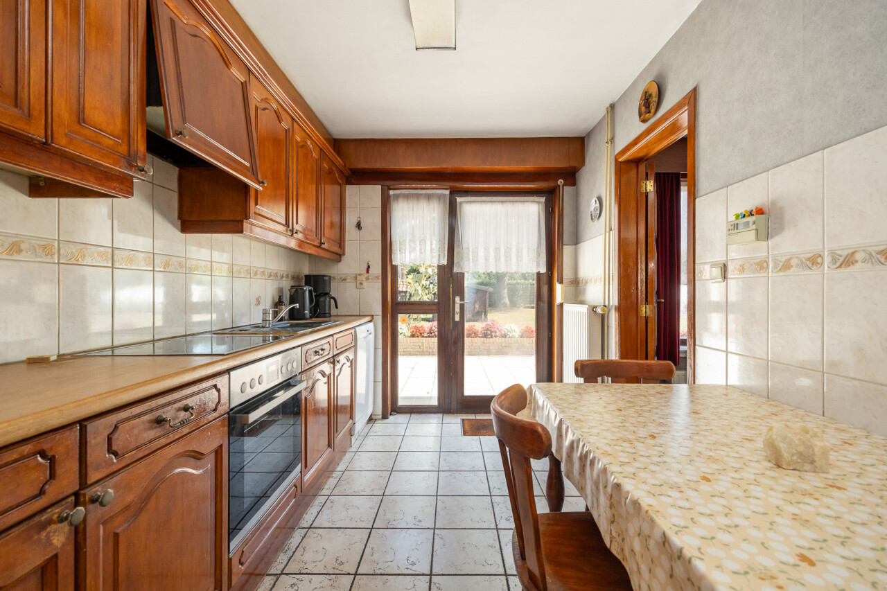 Keuken : tegelvloer, aanbouwkeuken met ceramische kookplaat en damkap. Buitendeur naar het terras.