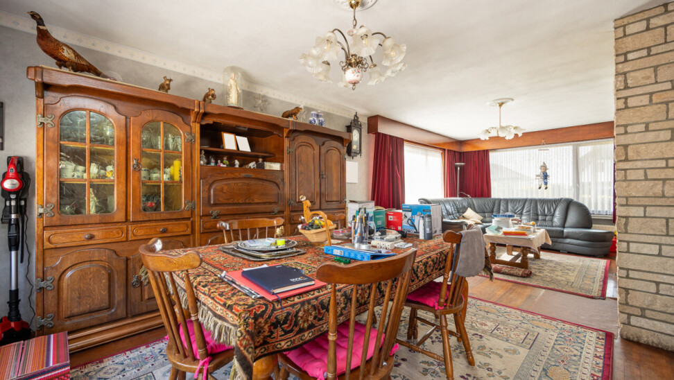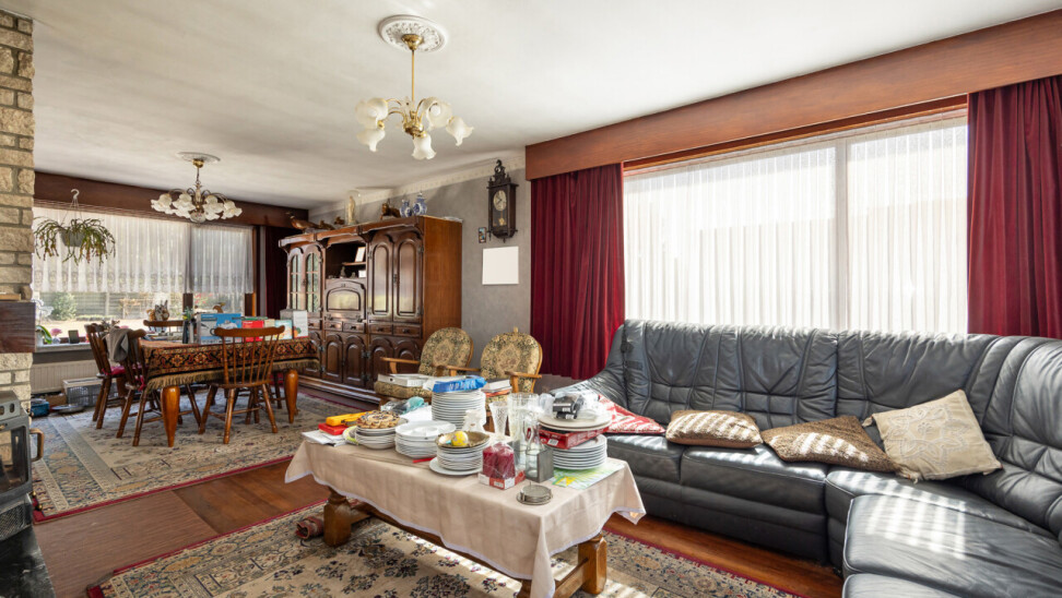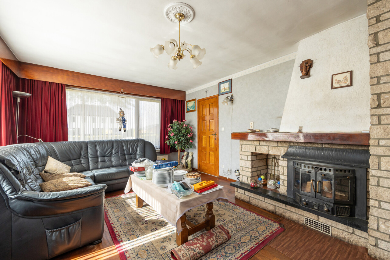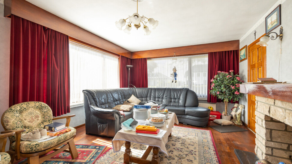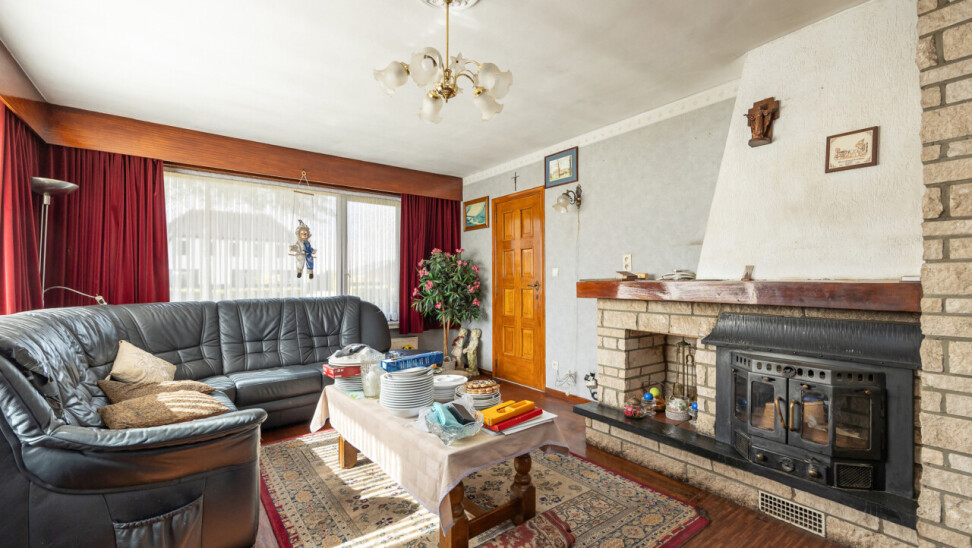Woonkamer : 8,50 m x 4,00 m : parketvloer, sierschouw met houtkachel.