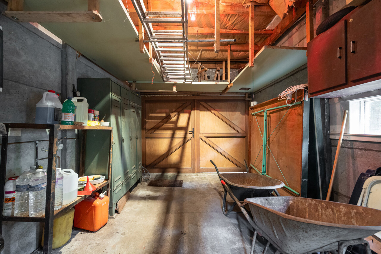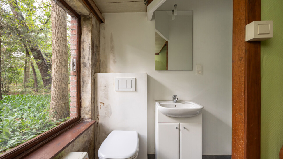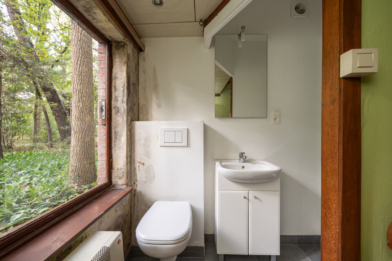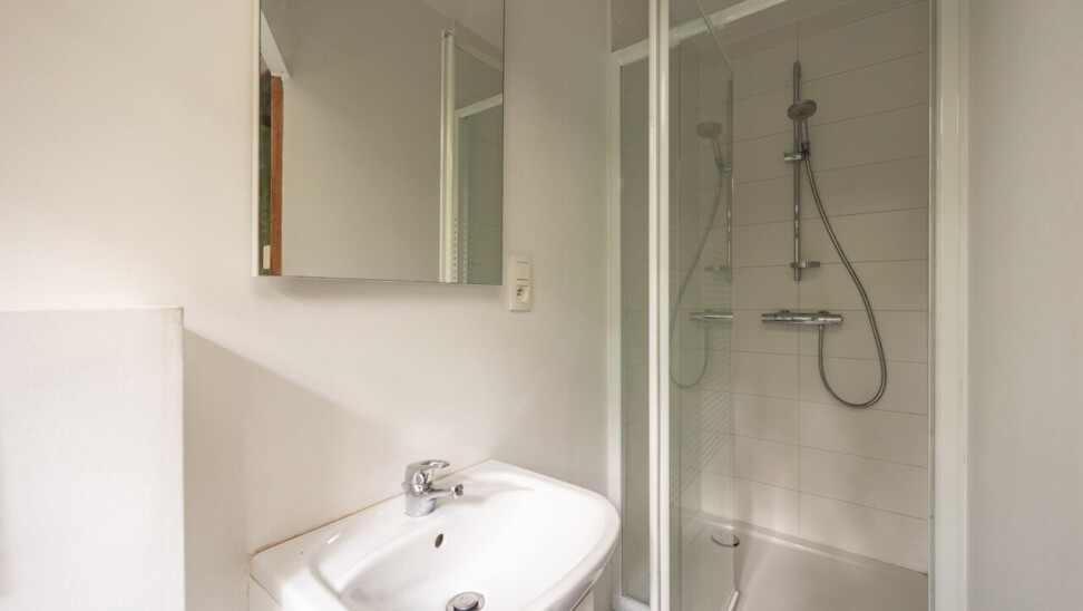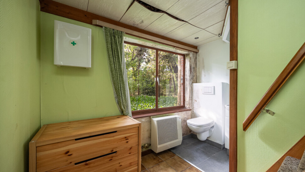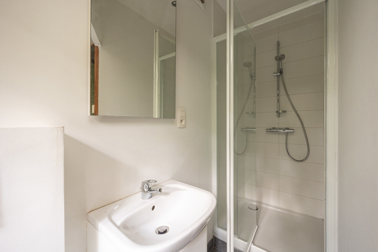 Badkamer : met ingemaakte kasten, douche, wastafel en toilet. Tweede trap naar de verdieping.
