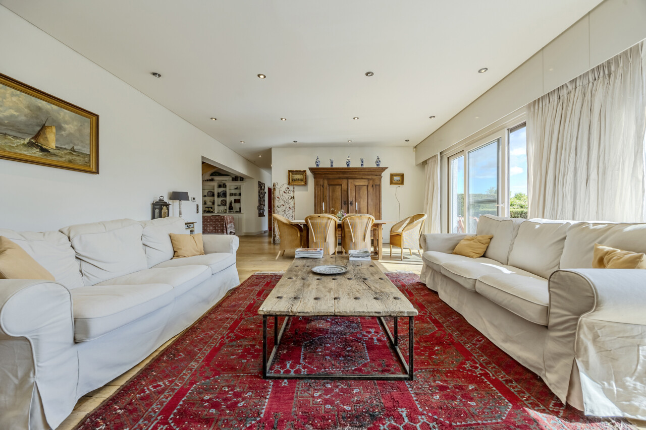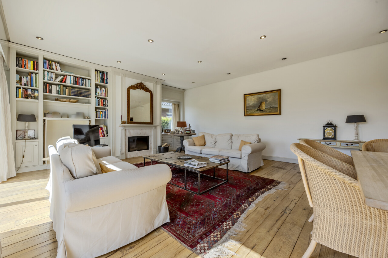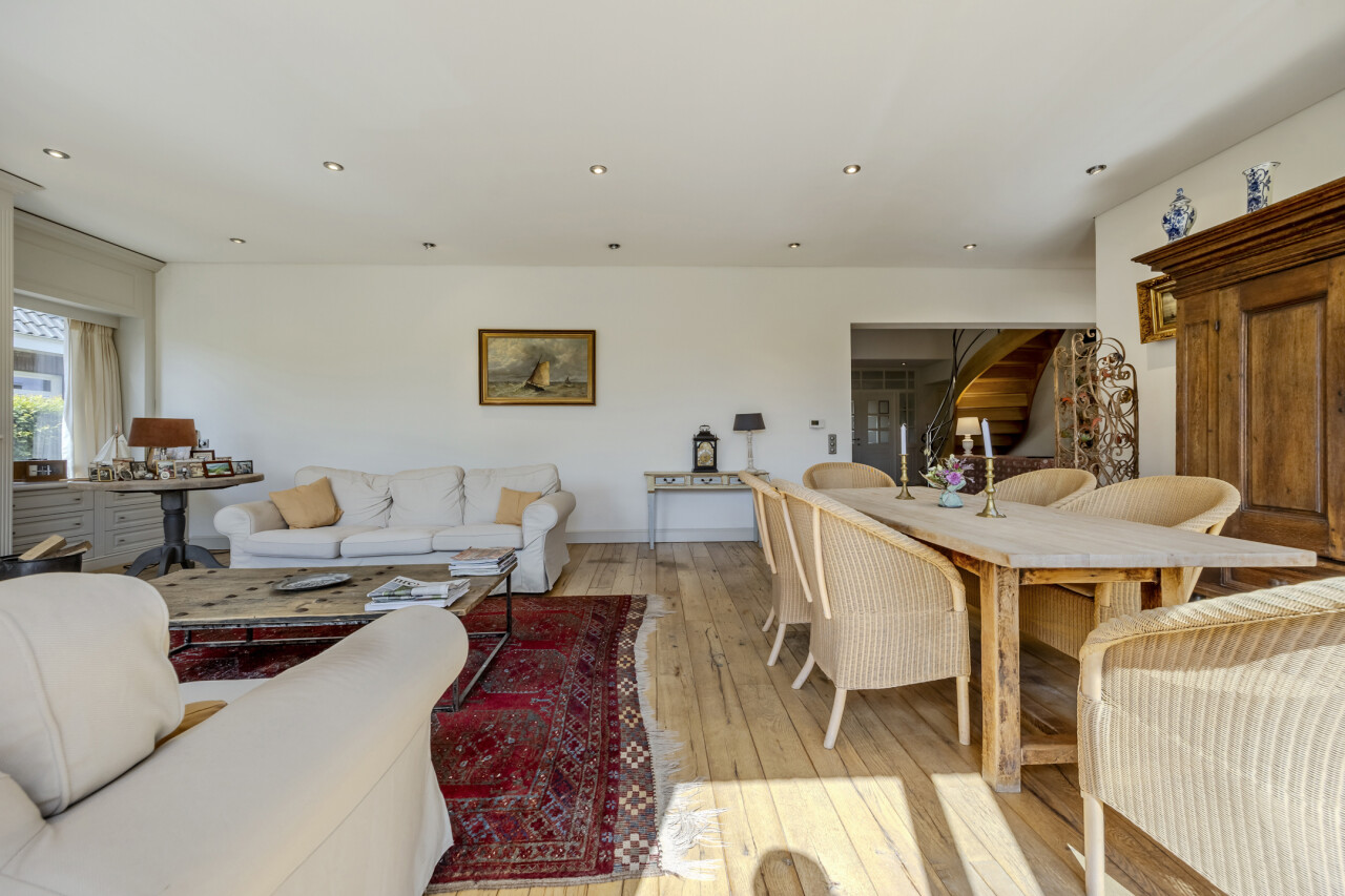 Woonkamer - eetkamer : originele open indeling met trap naar de verdieping / eikenhouten parketvloer / verschillende schuiframen met toegang tot terras en tuin.
