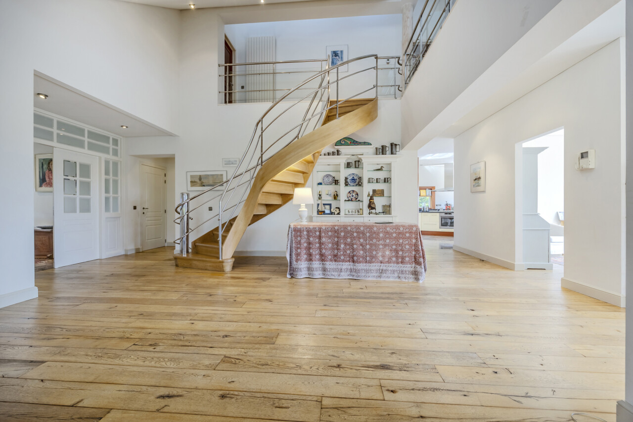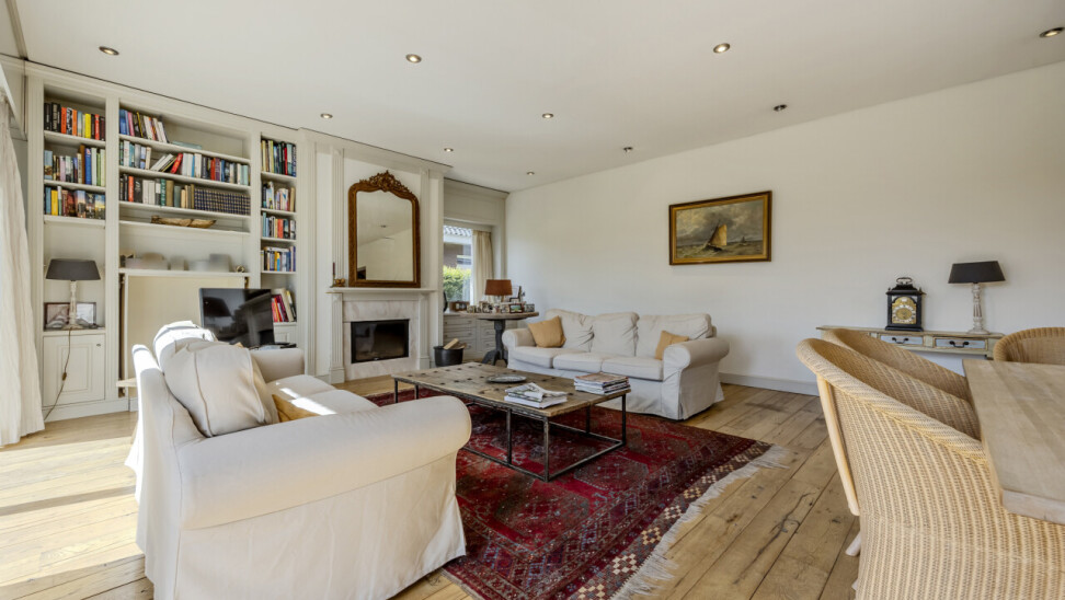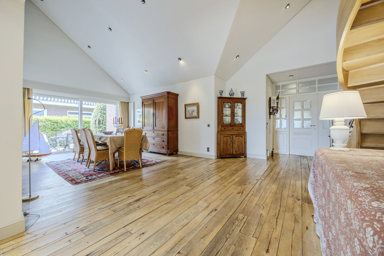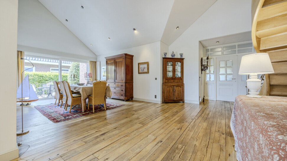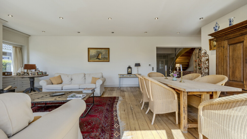 Woonkamer - eetkamer : originele open indeling met trap naar de verdieping / eikenhouten parketvloer / verschillende schuiframen met toegang tot terras en tuin.