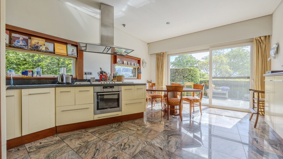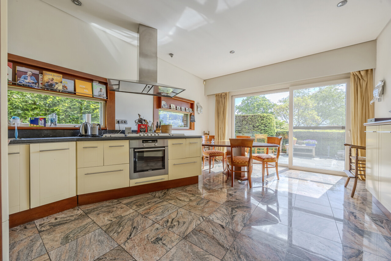 Keuken : aanbouwkeuken met luxe inrichting : 5-pits gasfornuis, dampkap, friteuse, warmhoudplaat, vaatwasser, koelkast, koffie-automaat, oven / natuurstenen tegelvloer.
