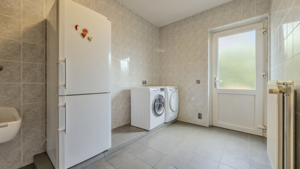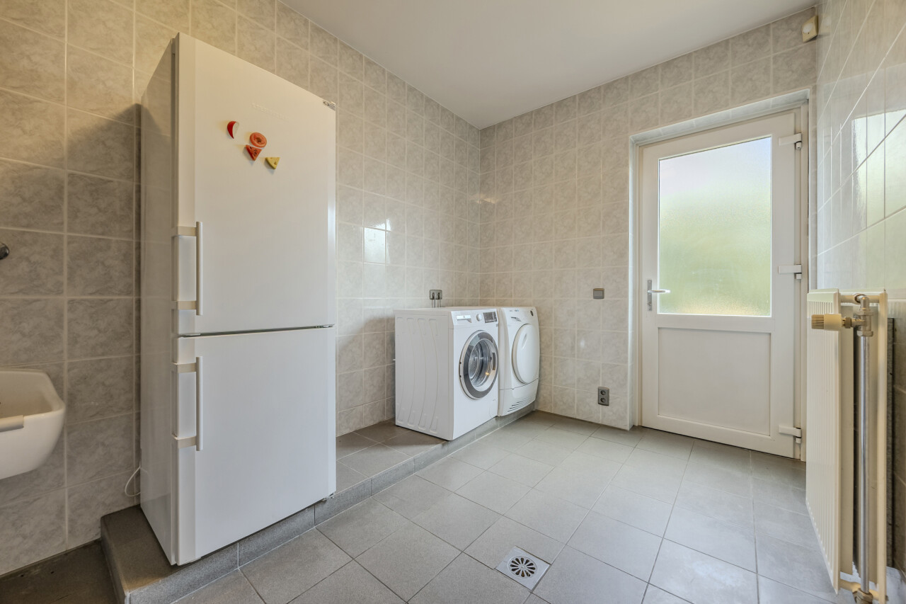 Bijkeuken : gootsteen en aansluitingen voor wasmachine en droogkast / toegang tot kelder en tuin.