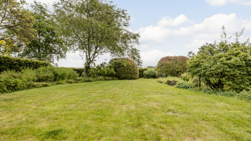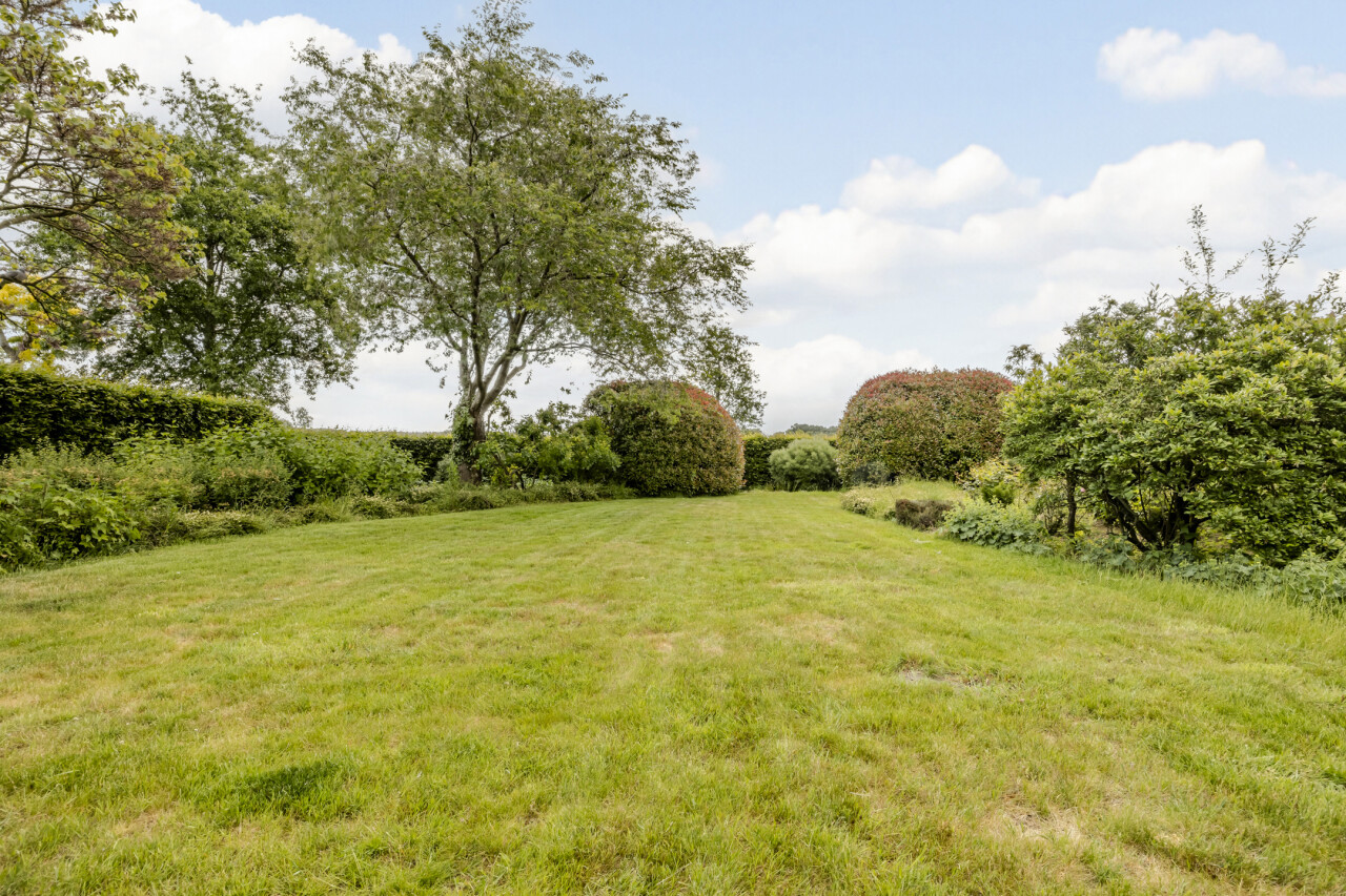 Aangelegde tuin met sproei-installatie en diverse terrassen / houten tuinhuis.