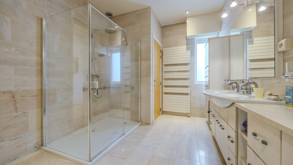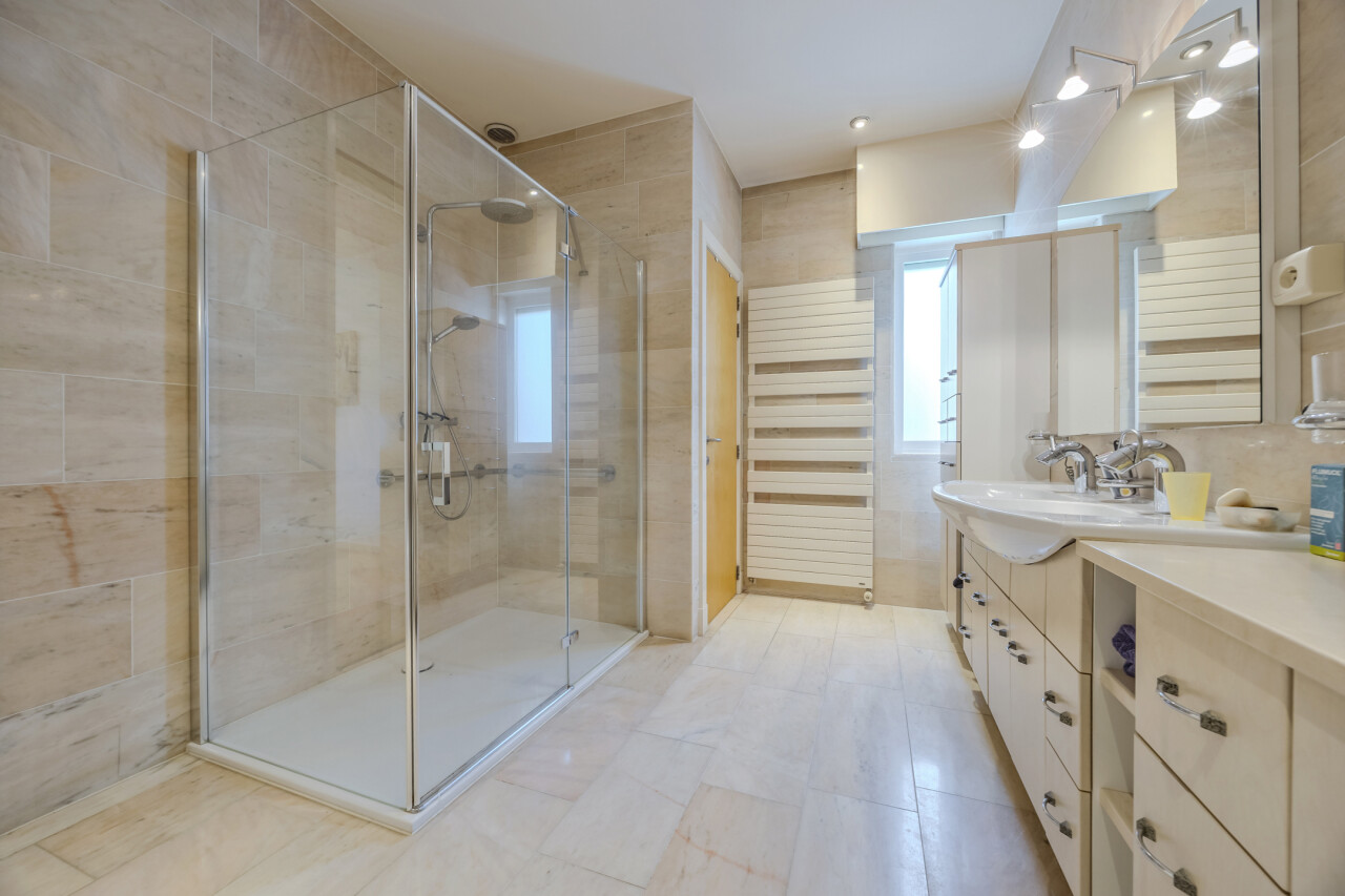 Badkamer : met ligbad, inloopdouche, dubbele wastafel, afzonderlijk toilet.