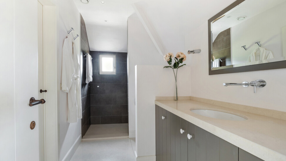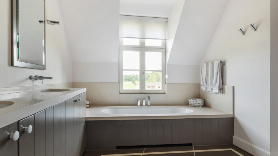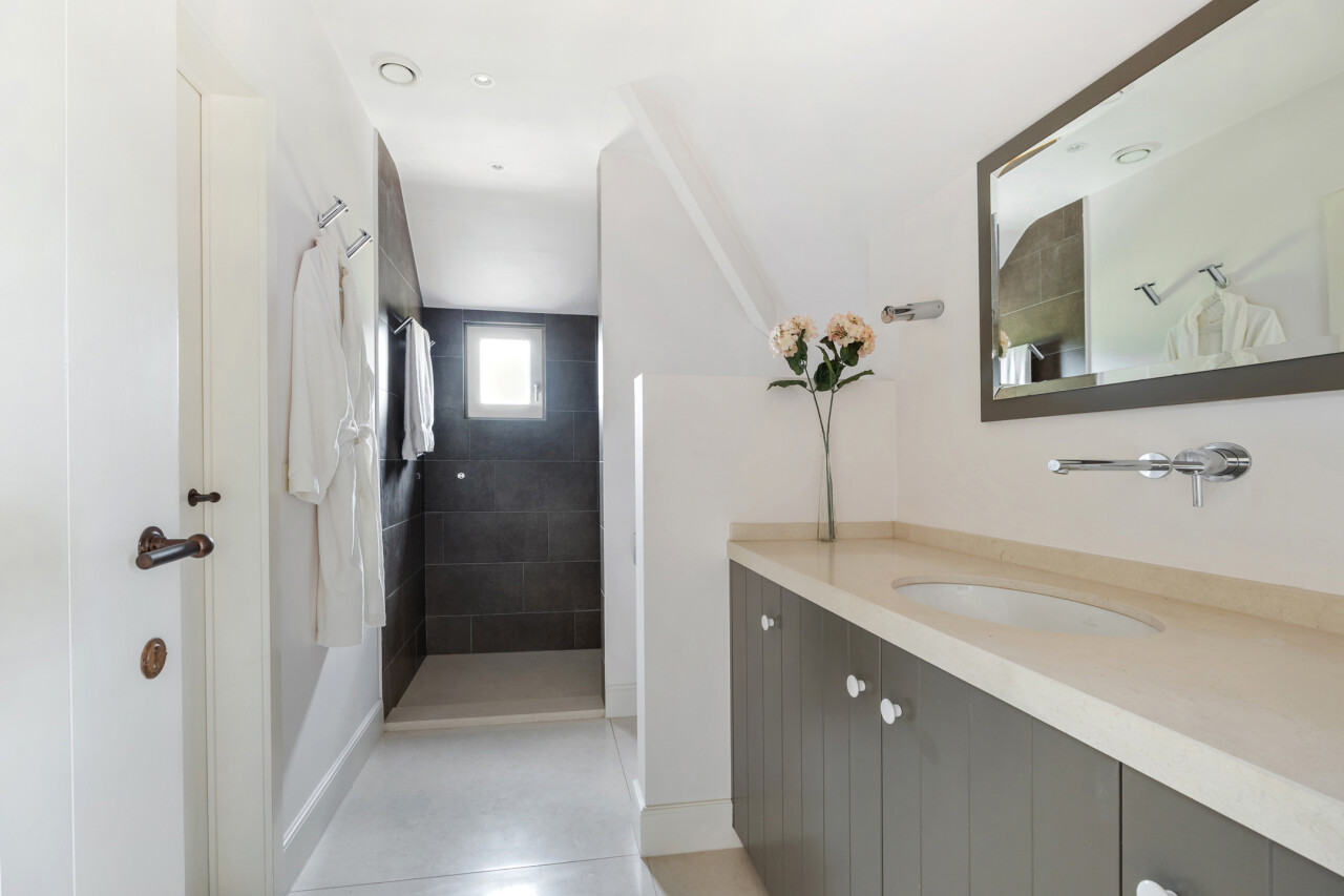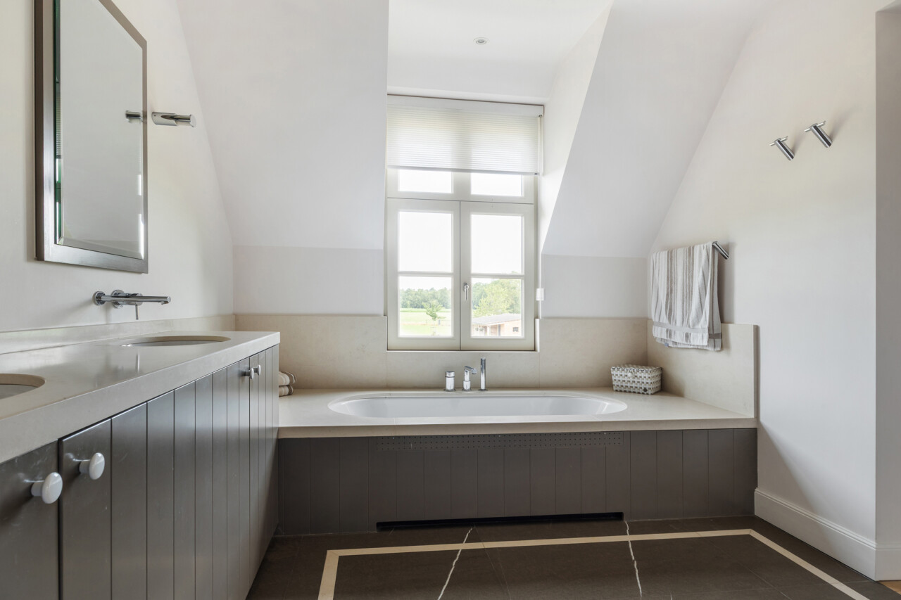 Badkamer 1 : met ligbad, inloopdouche met regendouchesproeier en een dubbele wastafel, kastenwand en toilet. Natuurstenen vloer.