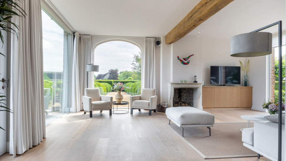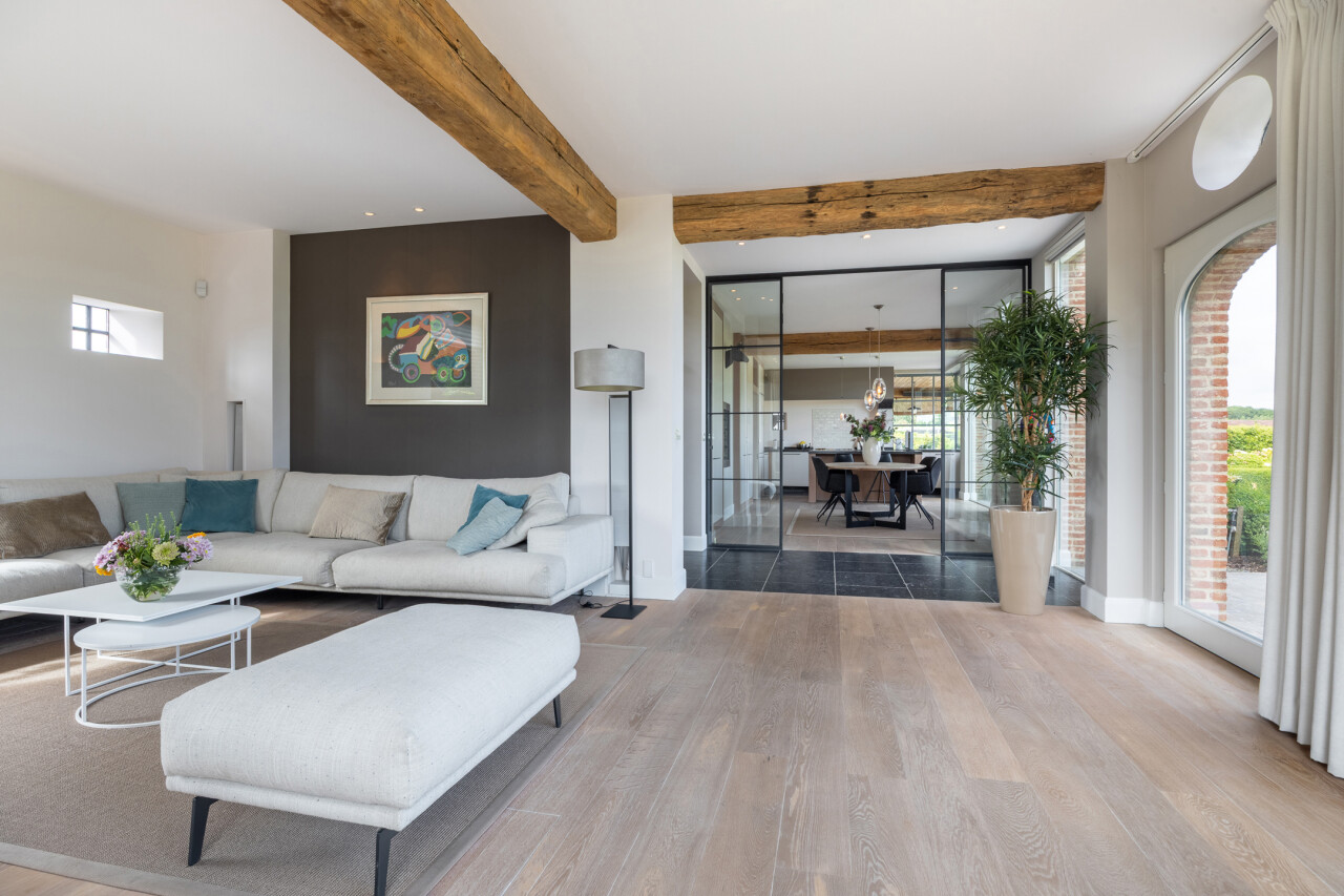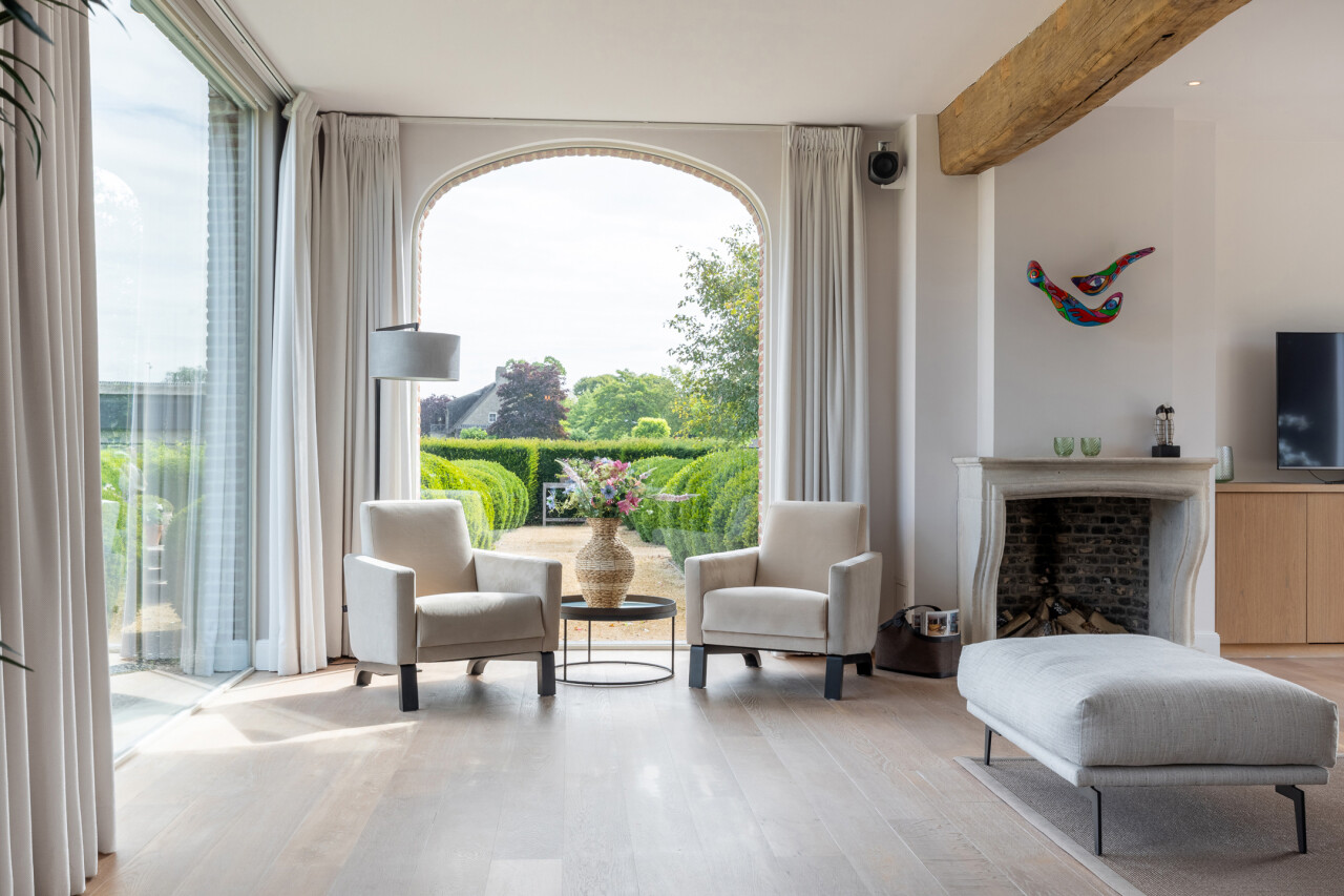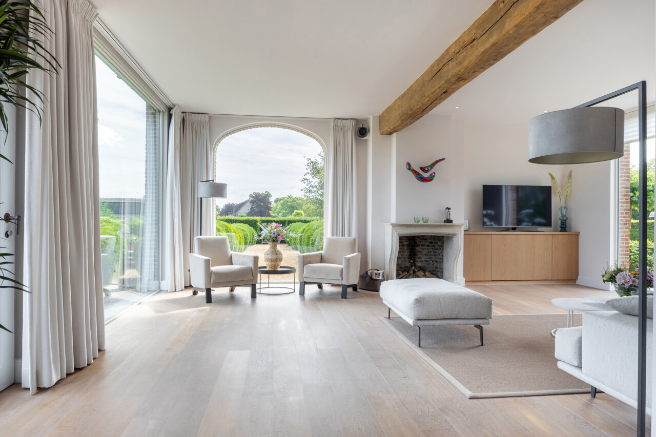 Woonkamer : met open haard en vele raampartijen met zicht op de tuin. Parketvloer. Middels een dubbele stalen deur met glasramen toegang tot de woonkeuken.