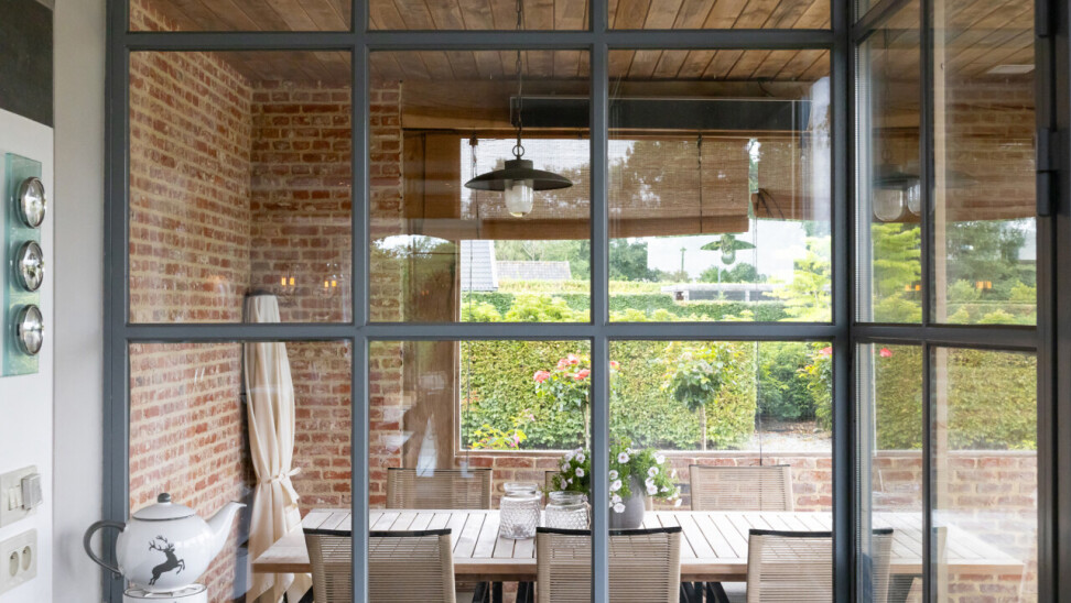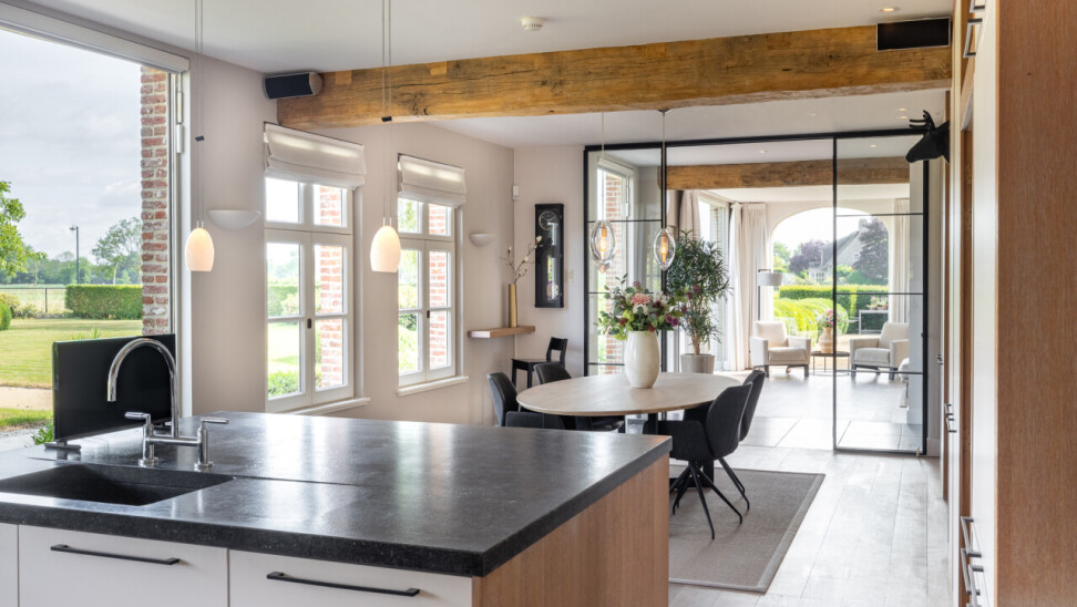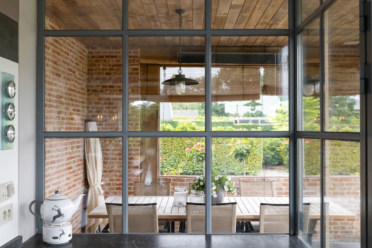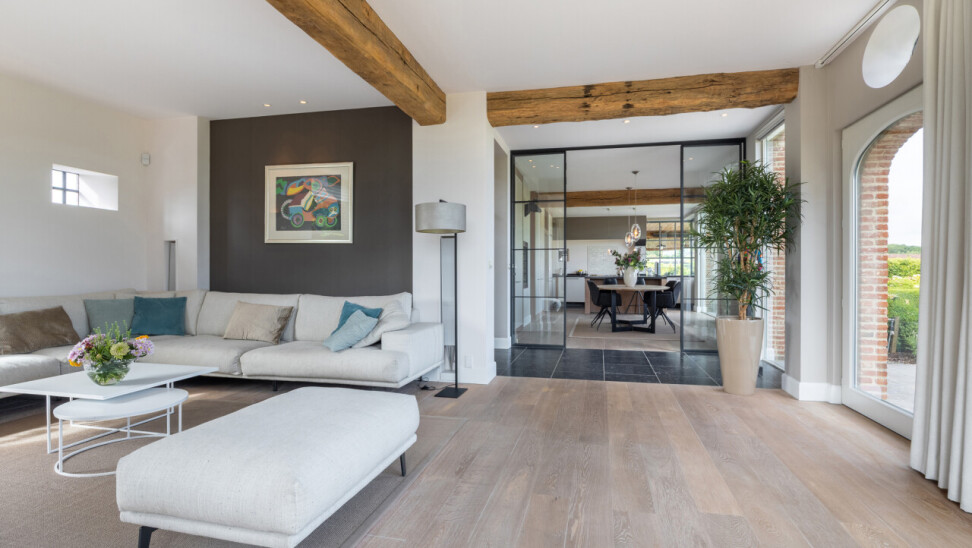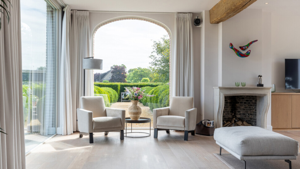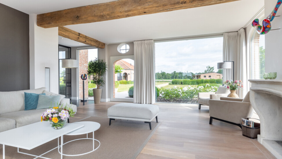 Woonkamer : met open haard en vele raampartijen met zicht op de tuin. Parketvloer. Middels een dubbele stalen deur met glasramen toegang tot de woonkeuken.