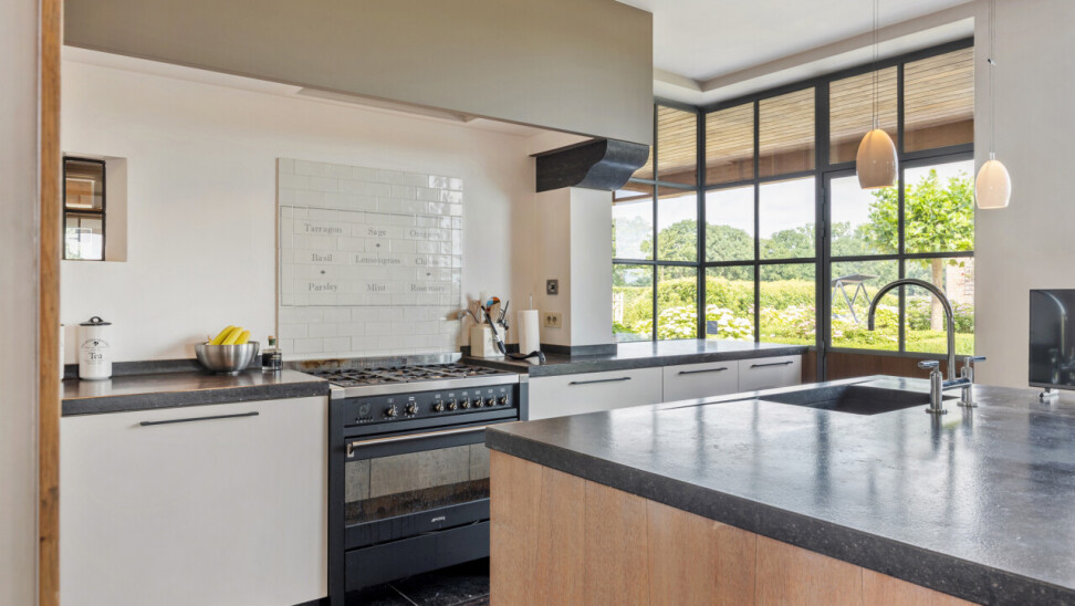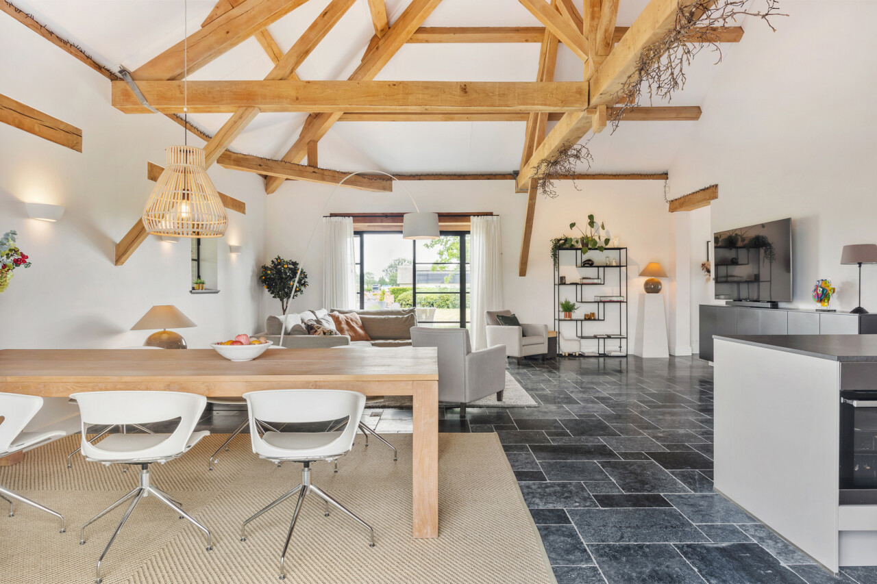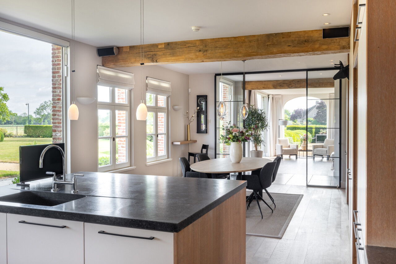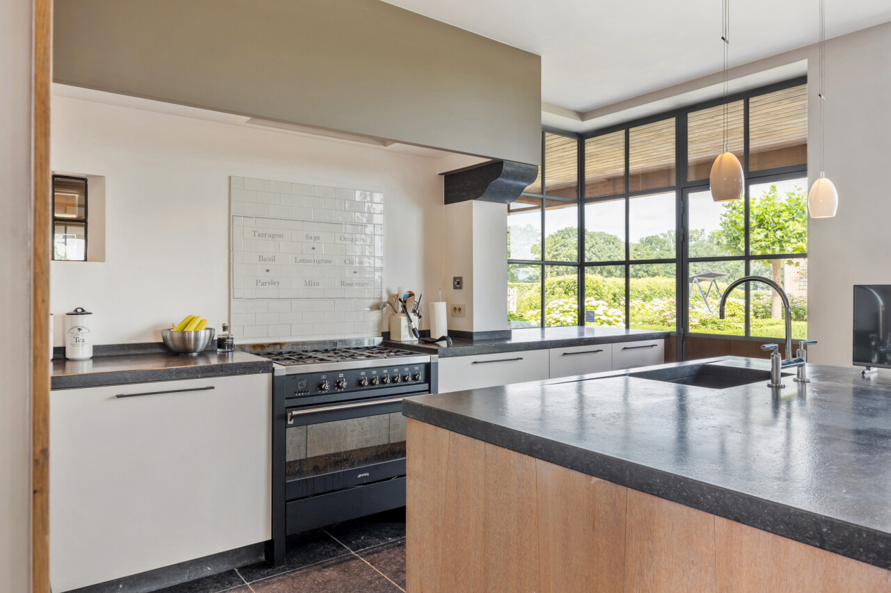 Keuken : ruime woonkeuken met aanbouwkeuken met alle keukentoestellen en kookeiland. Open haard en vele ramen met zicht op de tuin. Gedeeltelijk parketvloer en deels natuurstenen vloer. Doorgang naar de bijkeuken.