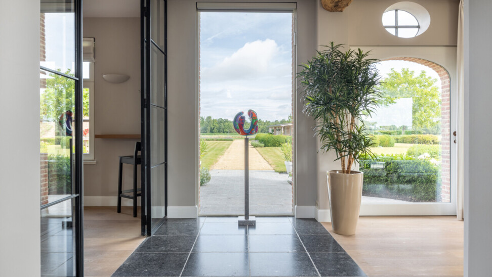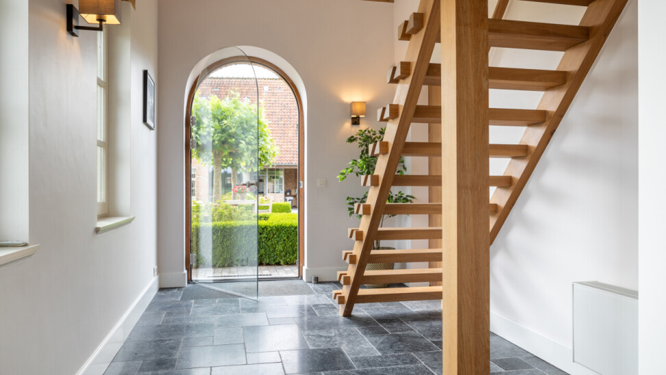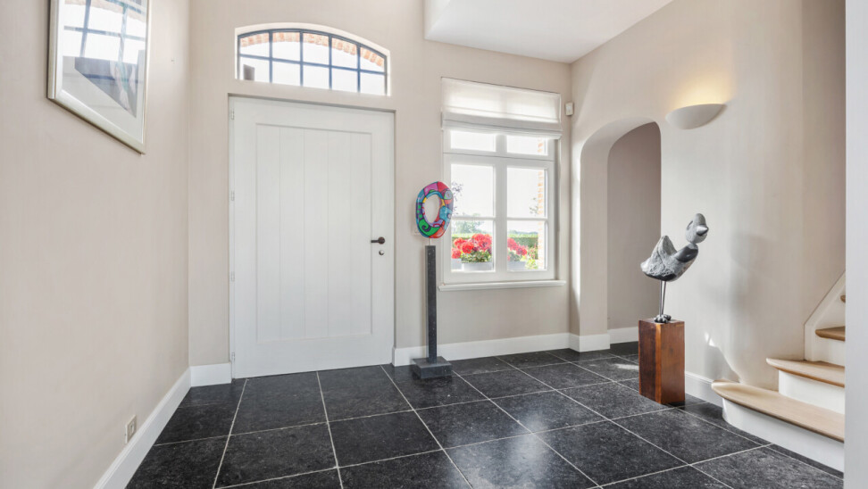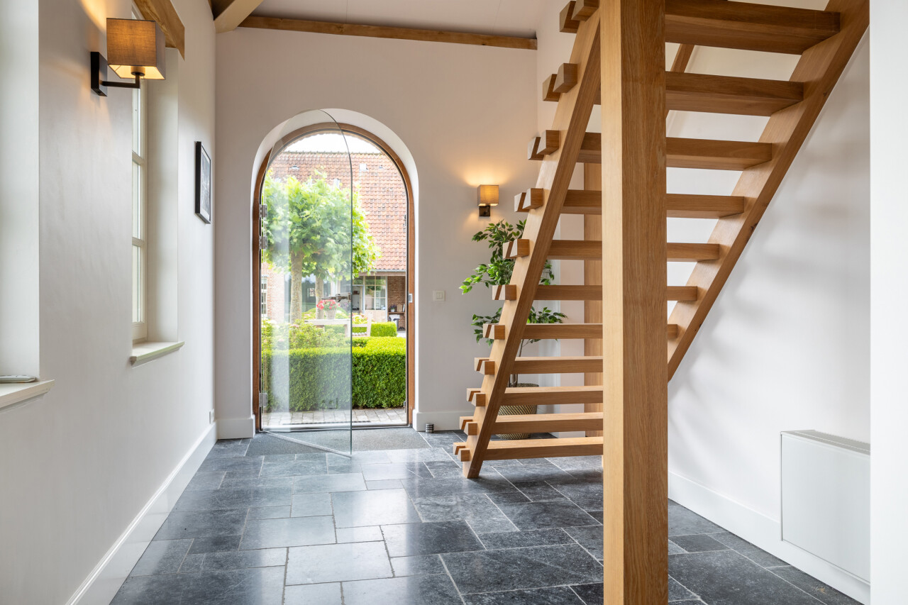 Inkomhal : ruime inkomhal met vide, open trap, gastentoilet en open doorgang naar de woonkamer met zicht op de tuin. Natuurstenen vloer.