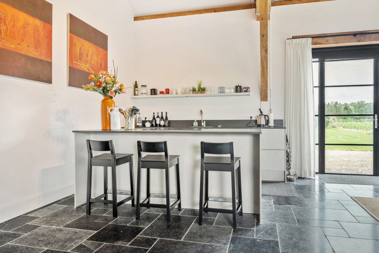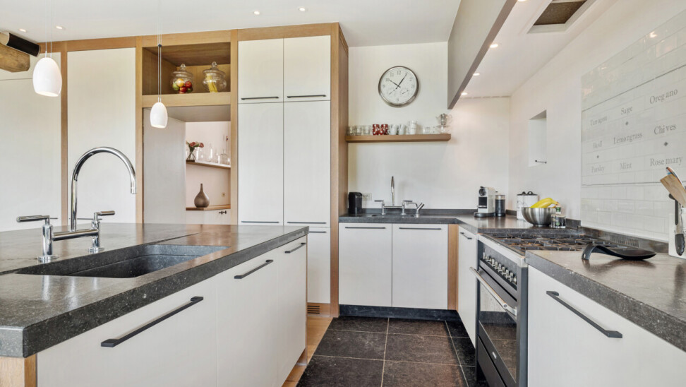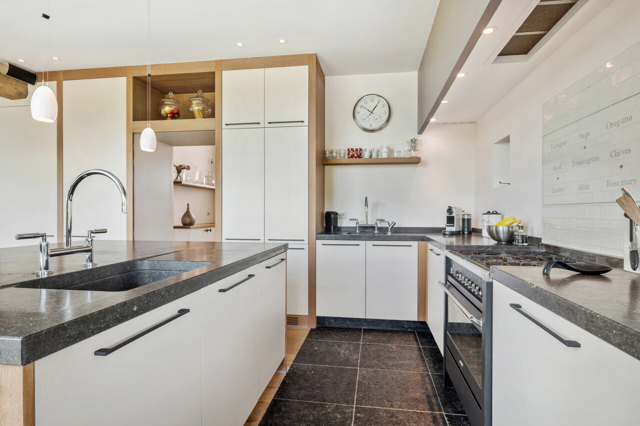 Bijkeuken : met u-vormige aanbouwkasten en spoelbak en doorgang naar een tussenhal met vaste kasten en een apart toilet. Achterdeur naar het overdekt terras en de tuin. Natuurstenen tegelvloer.