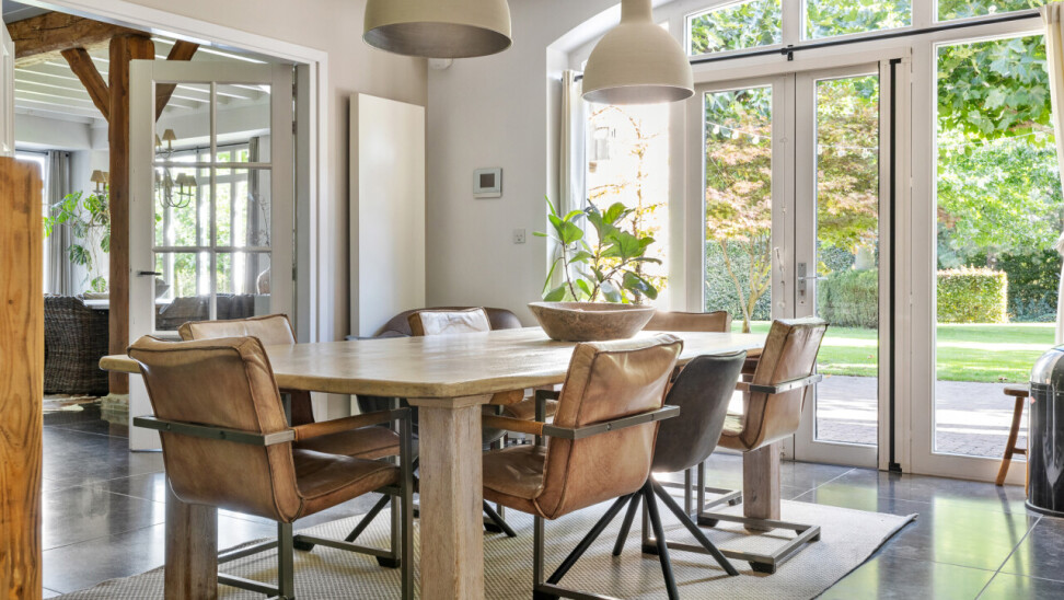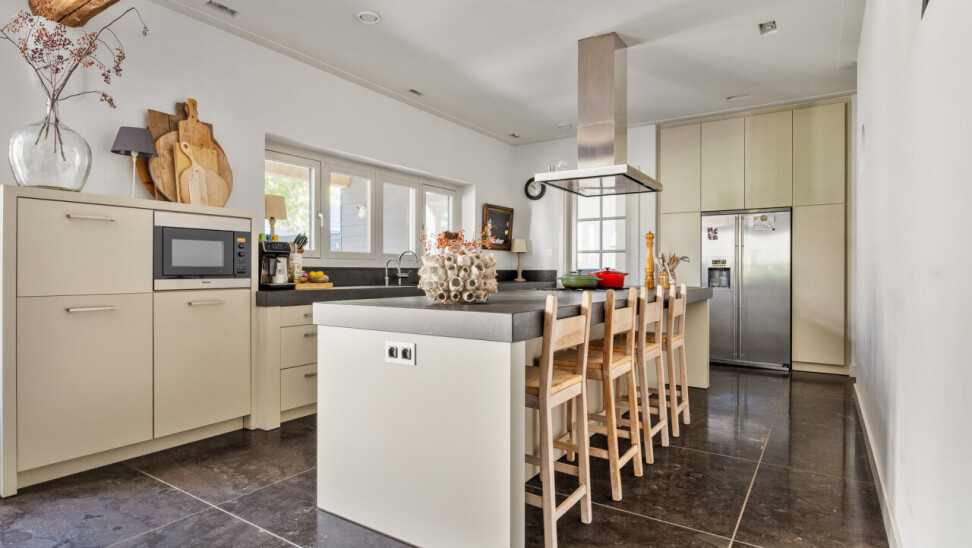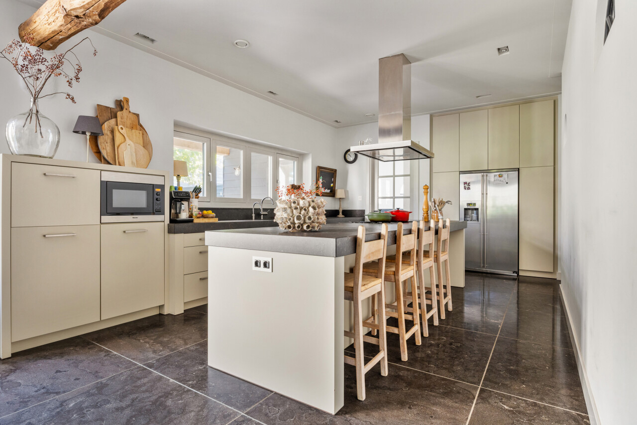 Keuken : open woonkeuken met eethoek en aanbouwkeuken met kookeiland, gasfornuis met oven, koelkast, vaatwasser, toegang tot de bijkeuken, dubbele openslaande deuren die toegang geven tot de tuin.