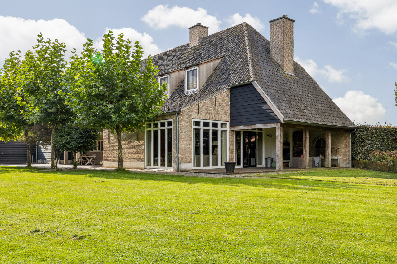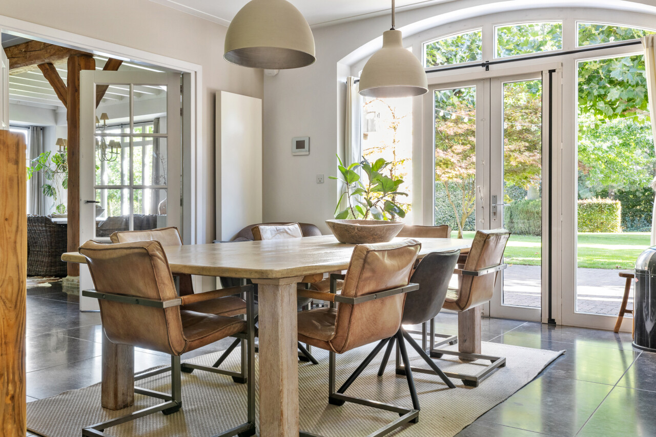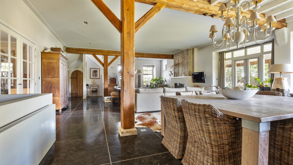 Woonkamer : zeer ruime woonkamer met houten balken, prachtige lichtinval, designtrap naar de verdieping, schouw met sfeervolle gashaard en openslaande deuren naar een overdekt terras en de tuin.